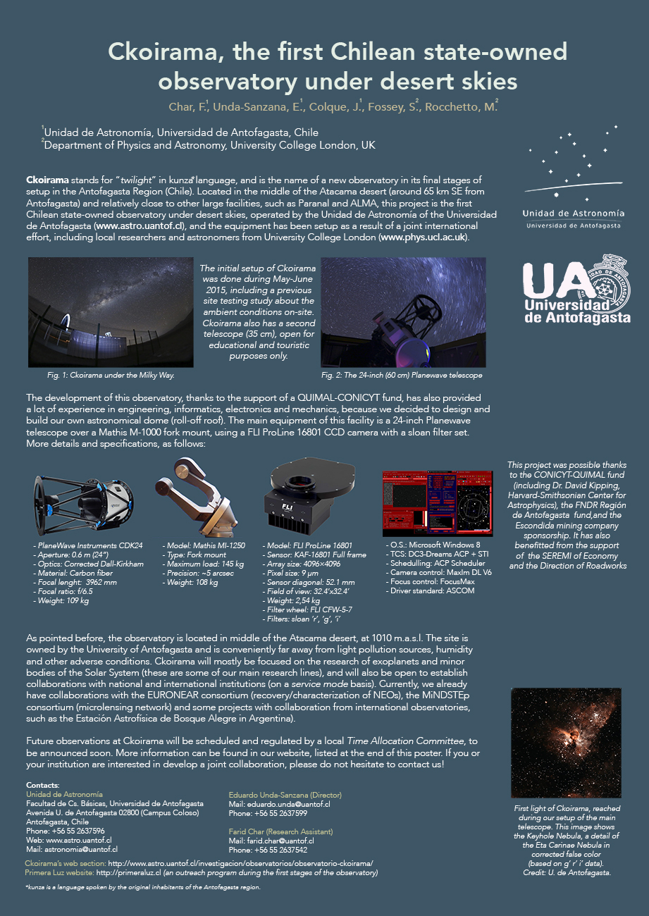 El póster de Ckoirama, en específico, tuvo por objetivo anunciar el primer observatorio profesional público de Chile, y de paso generar una vinculación a instituciones argentinas, que tengan potencial interés en establecer colaboraciones científicas.